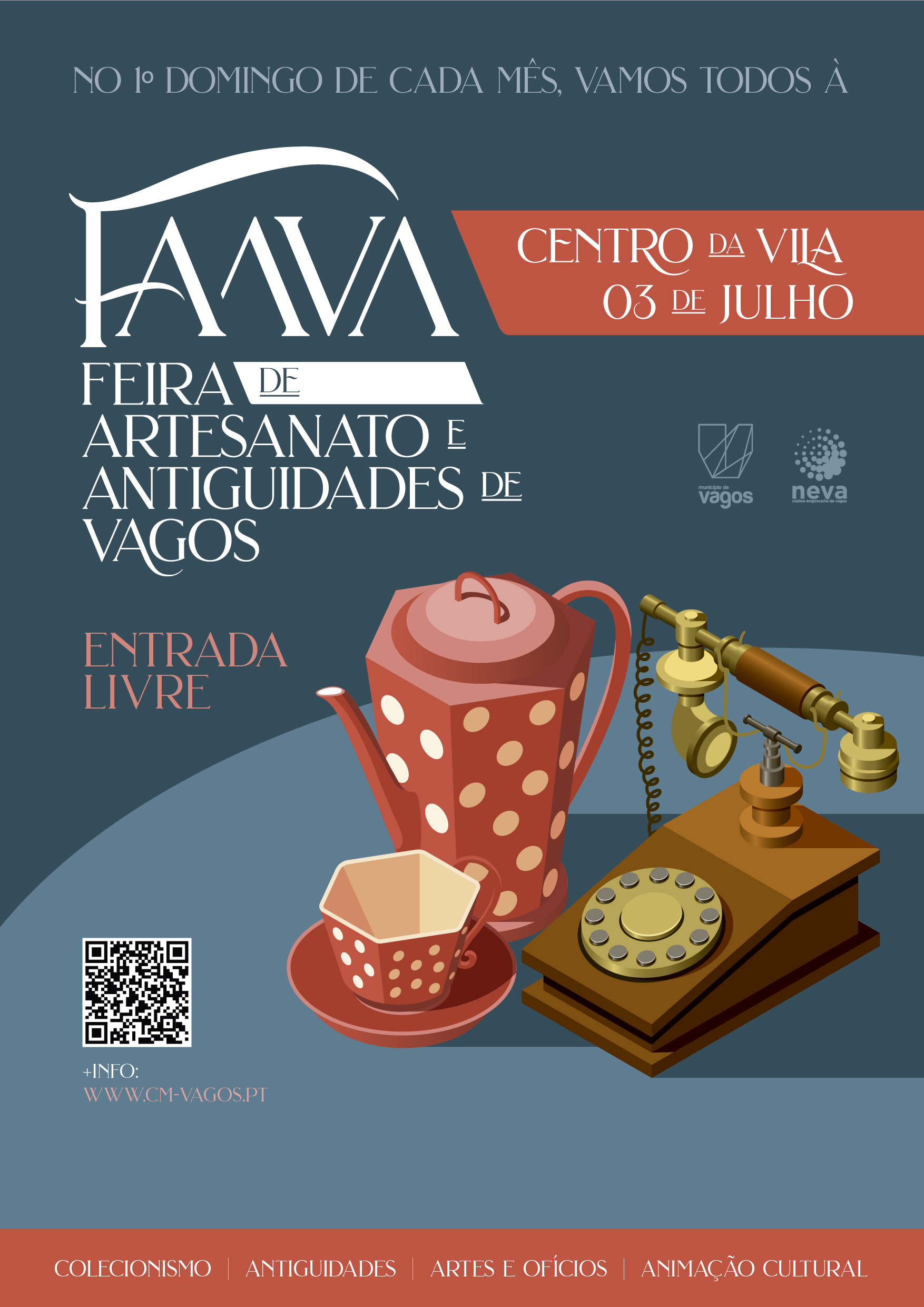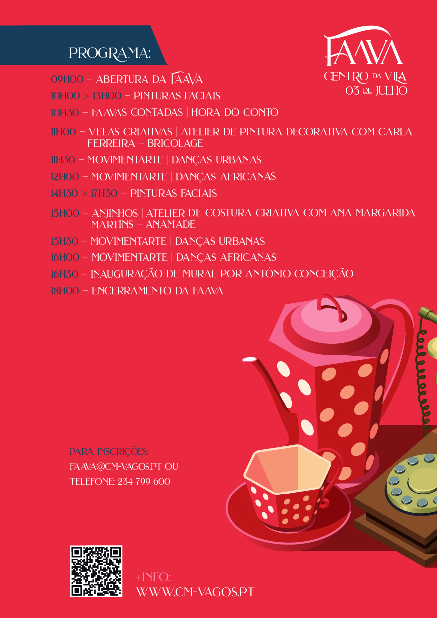 O Município de Vagos e o Núcleo Empresarial de Vagos (NEVA) irão realizar, no próximo dia 3 de julho de 2022, entre as 09h00 e as 18h00, na Pérgola de Vagos (Centro da Vila de Vagos), a 4ª edição da FaaVa – Feira de Artesanato e Antiguidades de Vagos.