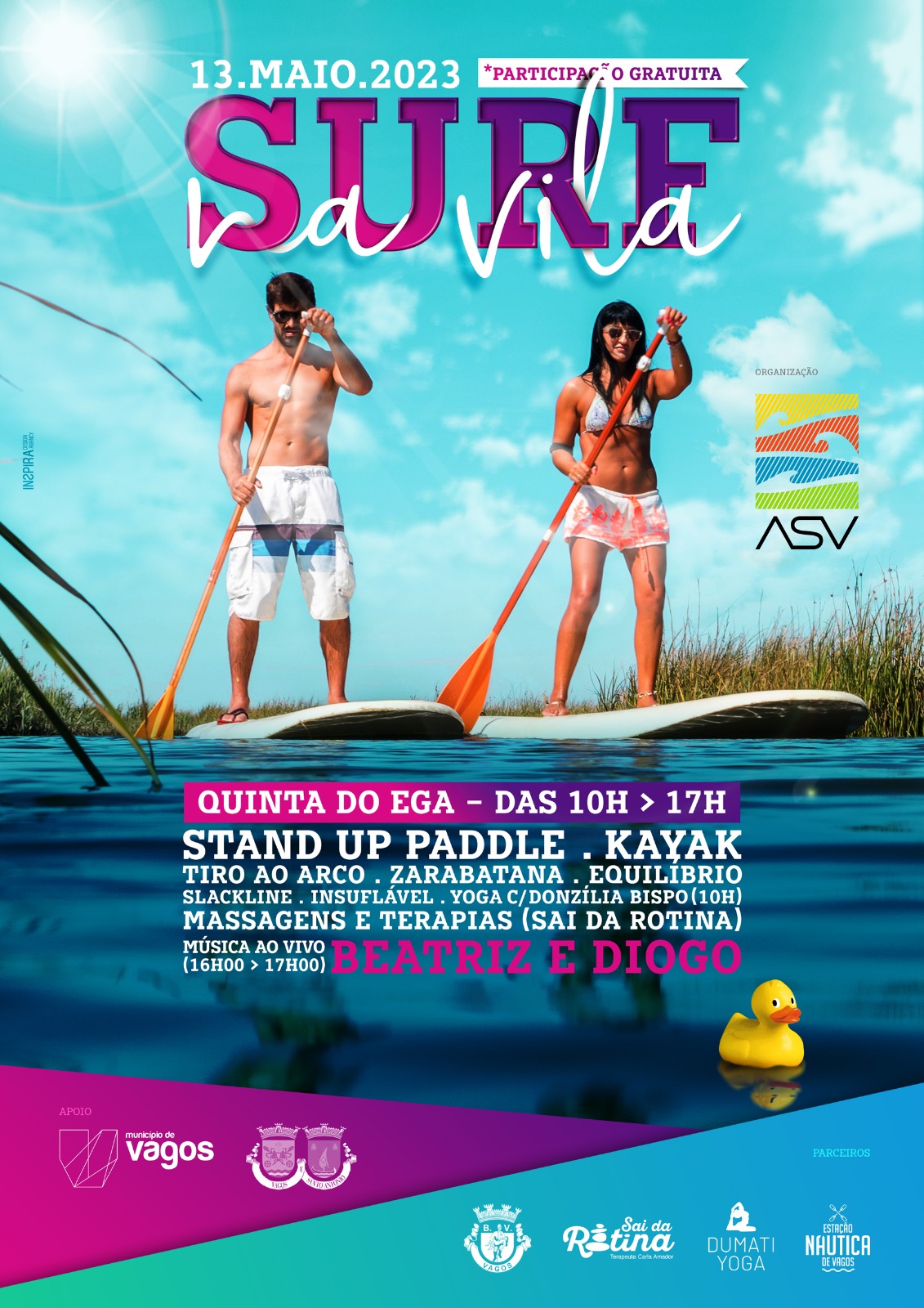 No próximo sábado, dia 13 de maio de 2023, entre as 10h00 e as 17h00, a Quinta do Ega, no centro da Vila de Vagos, recebe mais uma edição do evento "Surf na Vila".