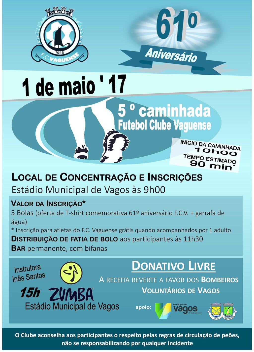 Inserida nas comemorações do 61.º aniversário do Futebol Clube Vaguense, terá lugar, no próximo dia 1 de maio 2017 , uma caminhada, pelas 10h00, com início no Estádio Municipal de Vagos.
