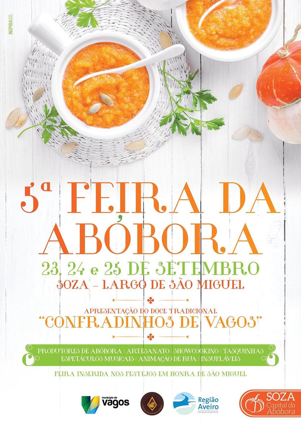 Inserida nas Festas em Honra ao Padroeiro da Freguesia de Soza, S. Miguel, a Confraria dos Sabores da Abóbora vai promover, nos dias 23, 24 e 25 de setembro, no Largo de São Miguel, a 5ª Feira da Abóbora.
