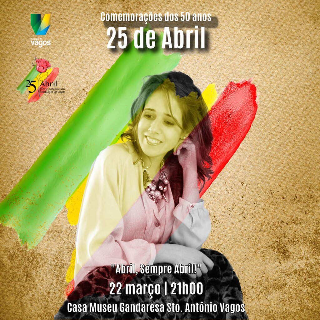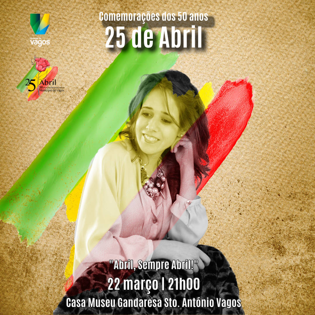 No dia 22 de março, cumprindo o propósito da descentralização das atividades das “Comemorações dos 50 anos do 25 de Abril”, pelas 21h00, a Casa Museu Gandaresa de Santo António de Vagos, vai ser palco para o concerto “Abril, Sempre Abril”. Com os vaguenses Andreia Alferes e Fábio Rocha envolvidos, este projeto mescla o fado e a música de intervenção, onde sobressaem os acordes da guitarra portuguesa na revisitação de algumas músicas que marcaram a viragem social, política e cultural mais importante no nosso país. Neste momento musical, Andreia Alferes e Fábio Rocha, terão a companhia de Yuri Reis e Pedro Martins, na guitarra clássica e na guitarra portuguesa, respetivamente.