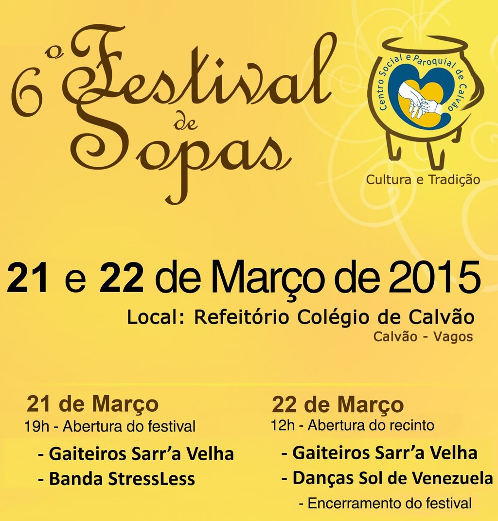 Nos próximos dias 21 e 22 de março de 2015 irá decorrer, no refeitório do Colégio de Calvão, o 6.º Festival das Sopas, organizado pelo Centro Social e Paroquial de Calvão.