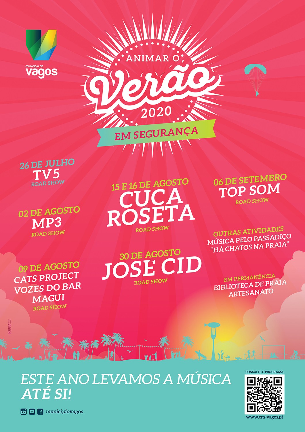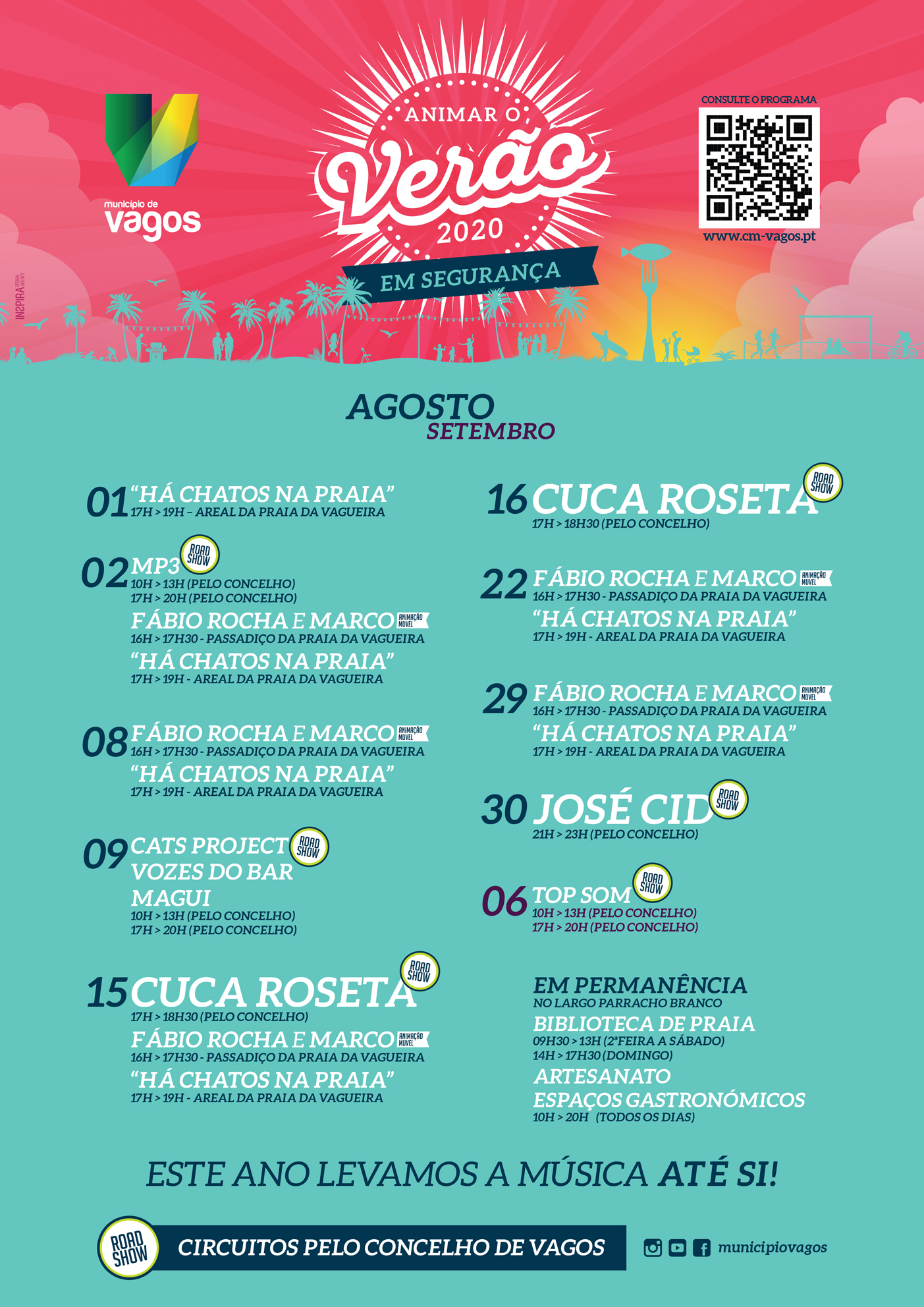 O Município de Vagos apresenta a sua programação de verão 2020, garantindo a animação e sobretudo a segurança de todos os intervenientes. De 26 de julho a 6 de setembro, está garantida muita música e animação, com segurança e em formato roadshow.