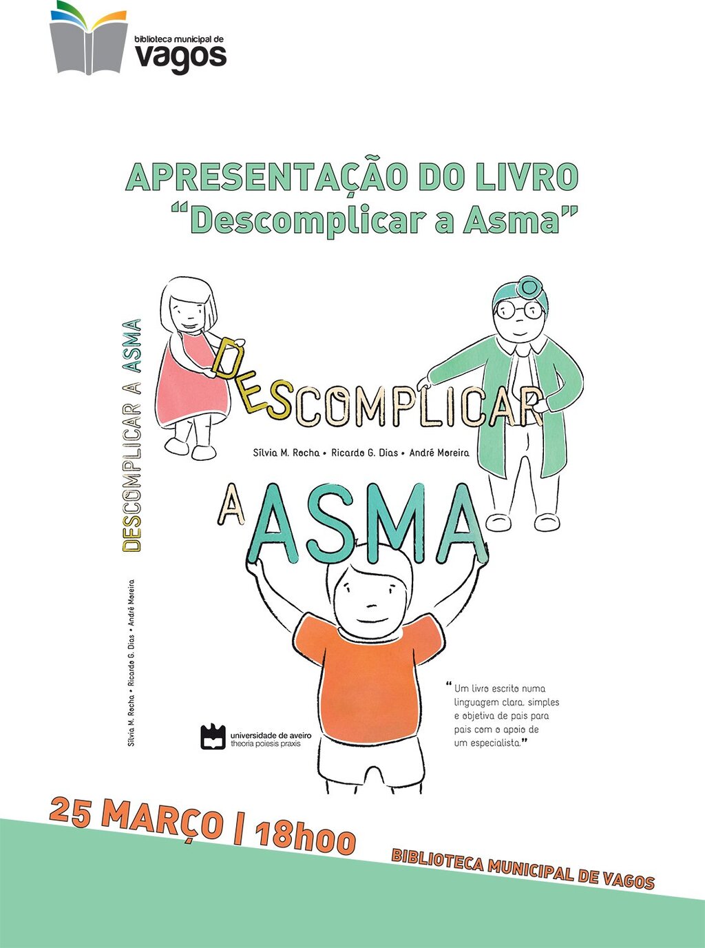 Decorre, no dia 25 de março de 2017, pelas 18h00, na Biblioteca Municipal de Vagos, a apresentação do livro “Descomplicar a Asma”, da autoria de Sílvia M. Rocha, Ricardo G. Dias e André Moreira.