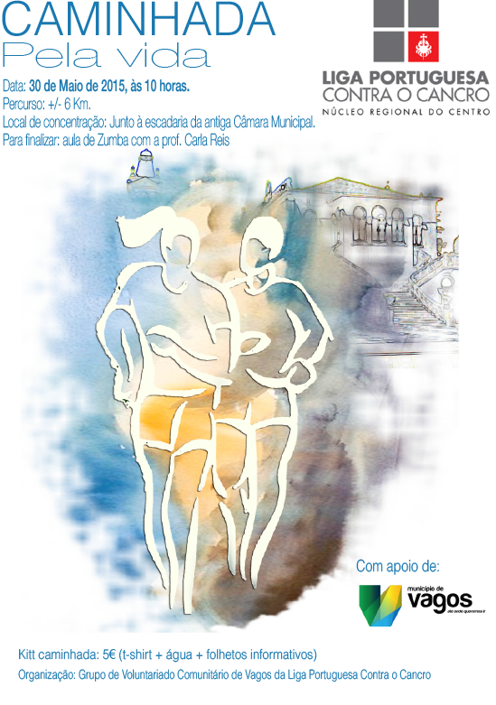 O Grupo de Voluntariado Comunitário de Vagos da Liga Portuguesa Contra o Cancro encontra-se a dinamizar uma Caminhada, que se realiza no dia 30 de maio, com início marcado para às 10h00 junto à escadaria da antiga Câmara Municipal. No final da caminhada, haverá uma aula de Zumba com a instrutora Carla Reis. Encontra-se à venda um kit caminhada no valor de 5€ que inclui uma t-shirt, água e crachá.