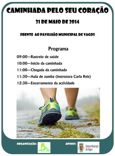 No mês de maio é comemorado o mês do coração e com o objetivo de promover a atividade física, na freguesia de Vagos, o Centro de Saúde de Vagos, através da sua Unidade de Cuidados na Comunidade (UCC) e Carla Reis (professora de educação física), irão realizar, no dia 31 de maio, da parte da manhã, uma caminhada.