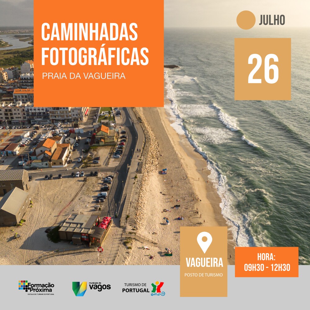 Esta ação, gratuita, decorre entre as 9h30 e as 12h30, por diversos locais da Praia da Vagueira e tem como objetivos conhecer e fotografar pontos emblemáticos desta praia ao mesmo tempo que se explora técnicas e dicas de fotografia digital de exterior e respetiva iluminação, com telemóvel ou máquina digital.