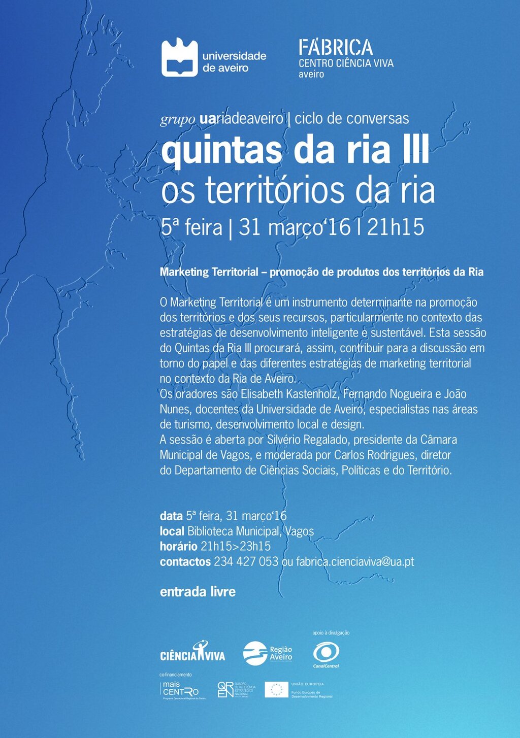 No próximo dia 31 de março, com início pelas 21h15 na Biblioteca Municipal de Vagos, irá decorrer uma sessão do Quintas da Ria III que procurará colocar em discussão, a importância do Marketing Territorial no contexto da Ria de Aveiro.