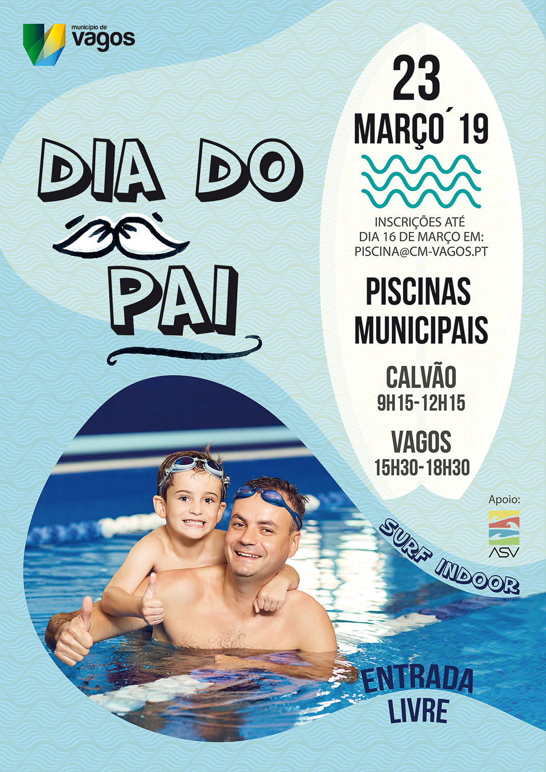 As atividades decorrem no dia 23 de março na Piscina de Calvão, de manhã, das 9h15 às 12h15 e na Piscina de Vagos, de tarde, das 15h30 às 18h30. Irão contemplar aulas livres, surf indoor e natação para pais e filhos, procurando, desta forma, estreitar os laços de afetividade entre pais e filhos, bem como incrementar a ligação da comunidade ao Complexo de Piscinas.