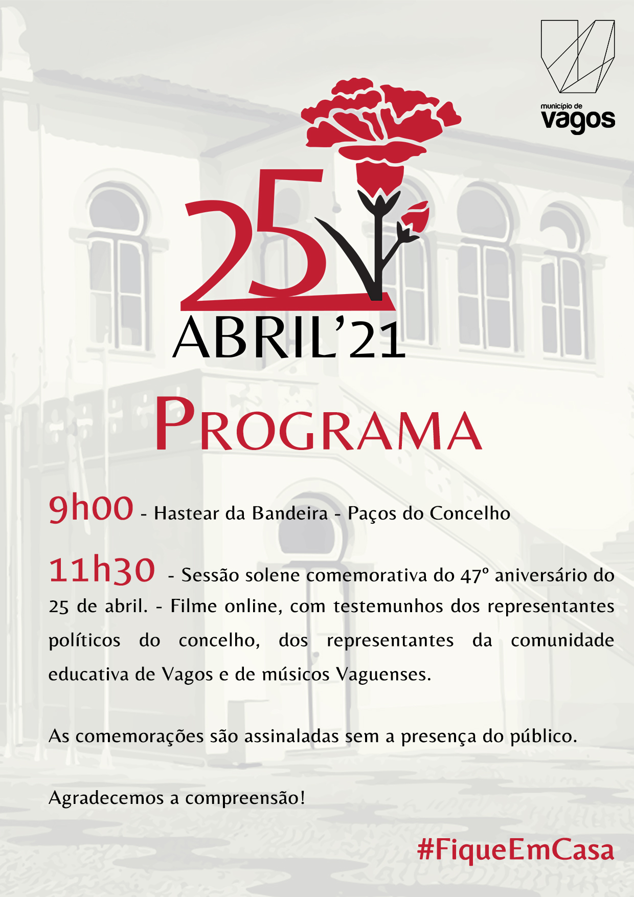 Deste modo, o Município de Vagos irá transmitir as celebrações através da sua página de Facebook (/municipiovagos) que terão início, pelas 9h00, com o Hastear da Bandeira, nos Paços do Concelho, e pelas 11h30 será transmitido um vídeo com as intervenções dos representantes dos Partidos que integram a Assembleia Municipal, do Presidente da Câmara e do Presidente da Assembleia Municipal de Vagos.