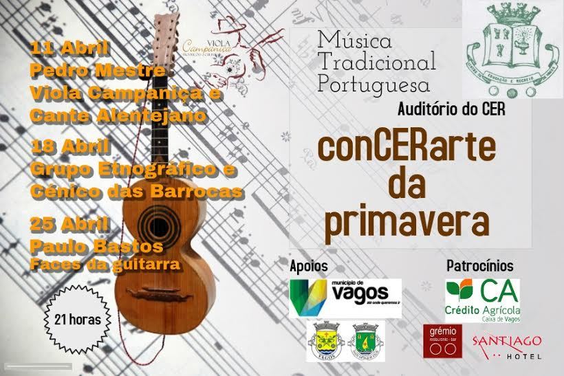 O Centro de Educação e Recreio de Vagos (CER) promove, no mês de abril, nos dias 11, 18 e 25, às 21h, no seu auditório, o “conCERart da primavera”, um ciclo de espetáculos dedicado a música tradicional portuguesa. O ciclo será constituído por 3 espetáculos, com início no dia 11 de abril com a atuação do músico Pedro Mestre, com a Viola Campaniça e o Cante Alentejano. Há 20 anos a cantar a música tradicional do Alentejo, pioneiro do projeto de salvaguarda do Cante, fundador e ensaiador de corais alentejanos, Pedro Mestre é um dos principais responsáveis pelo surgimento de novas gerações na música tradicional do Alentejo, levando o Cante Coral alentejano para as Escolas. Pedro Mestre decidiu lançar, no inicio deste ano um trabalho em nome próprio, Campaniça do Despique, sendo disco Antena 1. Esta é uma das grandes apostas deste conCERarte.