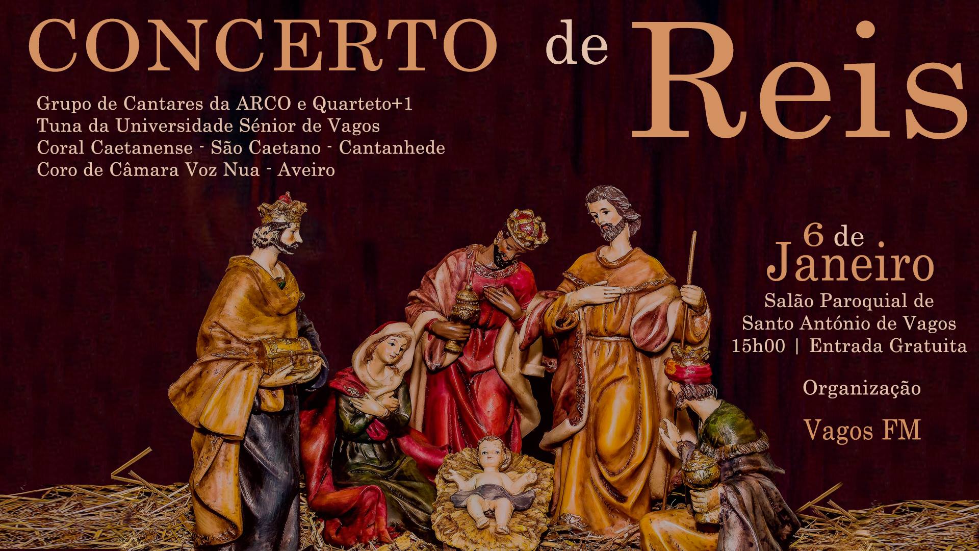 A rádio Vagos FM vai realizar, no próximo dia 6 de janeiro, um Concerto de Reis. A iniciativa, que será transmitida em direto, vai contar com a presença do Grupo de Cantares da ARCO, do Quarteto + 1, da Tuna da Universidade Sénior de Vagos, do Coral Caetanense e dos Voz Nua.