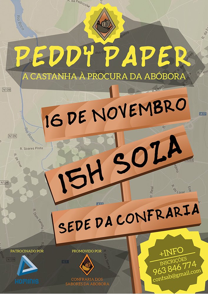 A Confraria dos Sabores da Abóbora encontra-se a organizar um Peddy-Paper que irá decorrer no dia 16 de novembro, em Soza, com início pelas 14h. com partida e chegada junto à sede da Confraria dos Sabores da Abóbora.