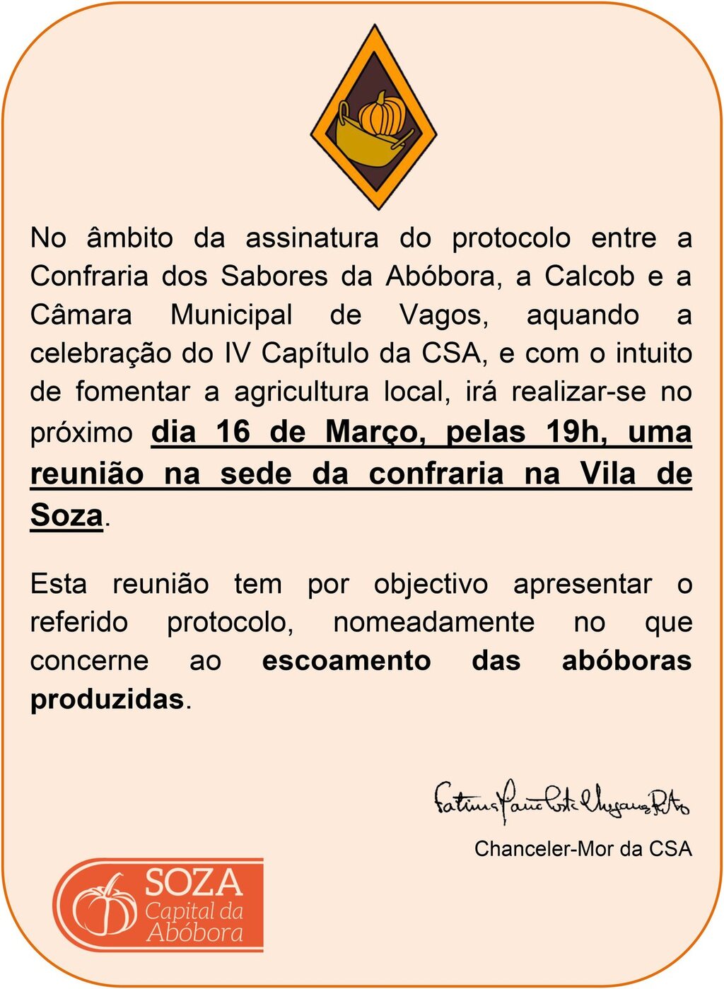 No âmbito da assinatura do protocolo entre a Confraria dos Sabores da Abóbora, a CALCOB e a Câmara Municipal de Vagos, e com o intuito de fomentar a agricultura local, irá realizar-se no próximo dia 16 de março, pelas 19h, uma reunião na sede da confraria na Vila de Soza.
