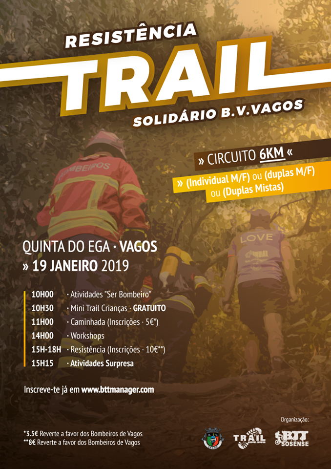 Realiza-se, no dia 19 de janeiro de 2019, pelas 10h00, na Quinta do Ega, em Vagos, um Corta-Mato Trail solidário, cuja parte do valor irá reverter a favor dos Bombeiros Voluntários de Vagos.