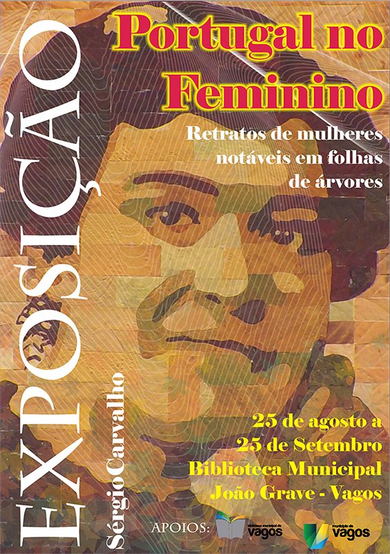 A partir da próxima quinta-feira, dia 25 de agosto de 2016, poderá visitar, pelas 18h00, na Biblioteca Municipal de Vagos, a exposição "Portugal no Feminino - Retrato de mulheres notáveis, em folha de árvore" de Sérgio de Carvalho.
