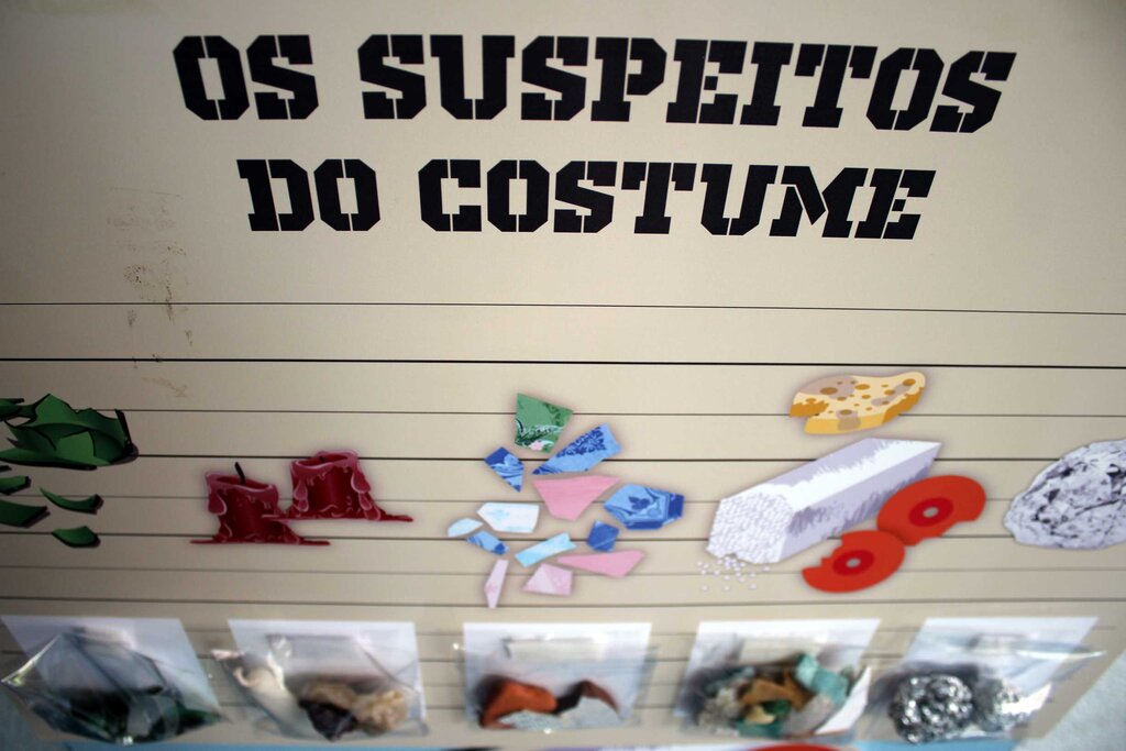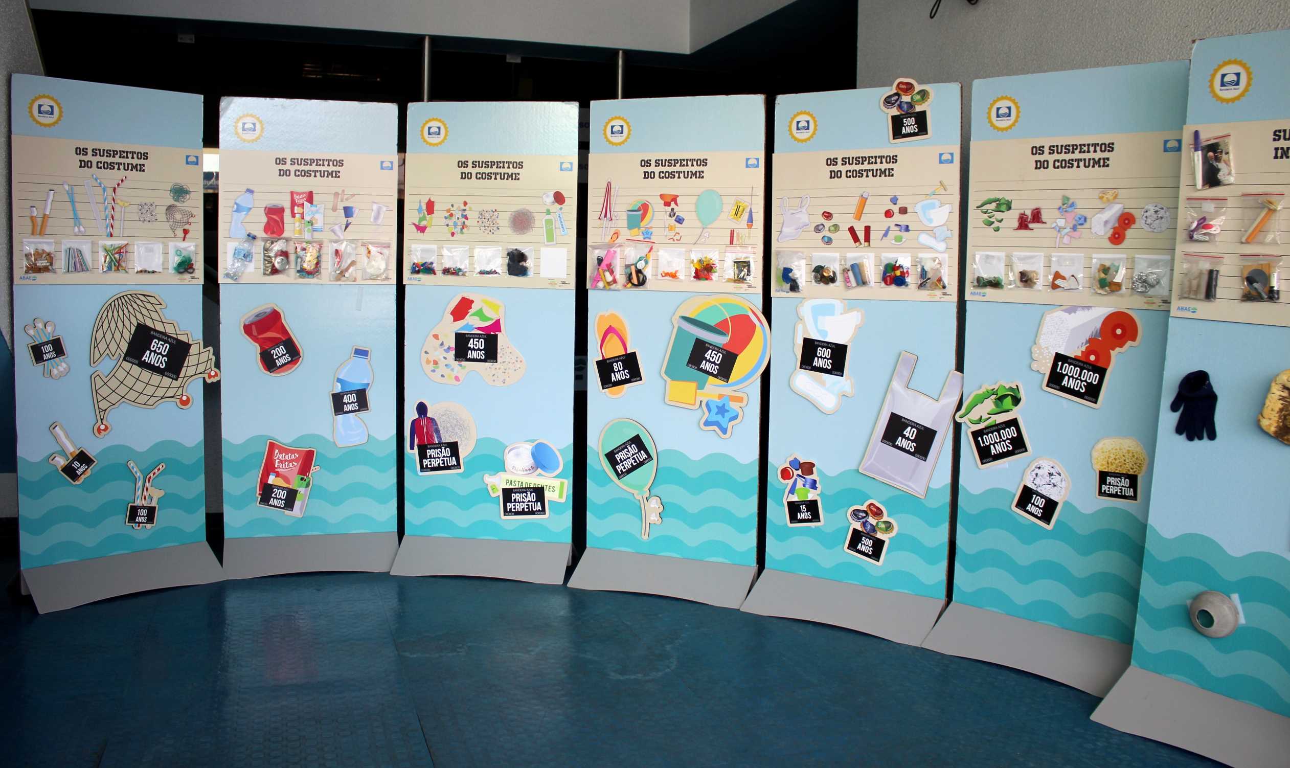 Os suspeitos são acompanhados pelas suas “penas de prisão”, ou seja, por peças em PVC, que indicam o tempo de duração dos resíduos no mar. Estas peças encontram-se colocadas junto à exposição e ajudam a sensibilizar para o impacto dos resíduos.