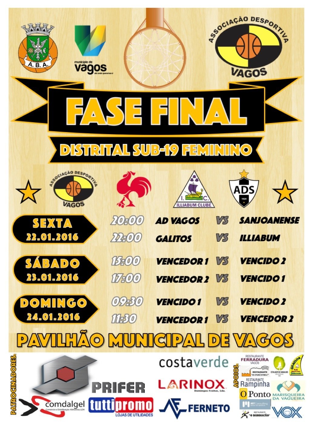De 22 a 24 de janeiro de 2016, realiza-se, no Pavilhão Municipal de Vagos, a Fase Final Distrital Sub 19 em Basquetebol Feminino, que irá receber as equipas AD Vagos, Sanjoanense, Galitos e Illiabum.