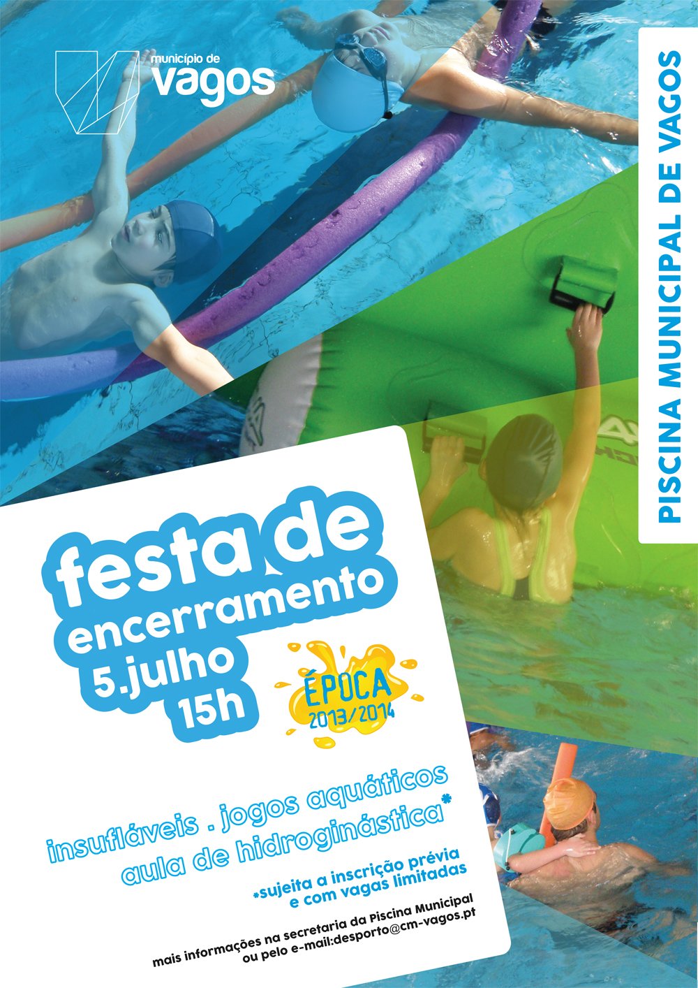 Realiza-se, no próximo dia 5 de julho de 2014, pelas 15h, a festa de encerramento da época 2013/2014 da Piscina Municipal de Vagos, para os alunos que frequentaram, durante esta época, a piscina municipal. Vai ser uma tarde cheia de atividades desde insufláveis, jogos aquáticos e uma aula de hidroginástica (sujeita a inscrição prévia e com vagas limitadas).
