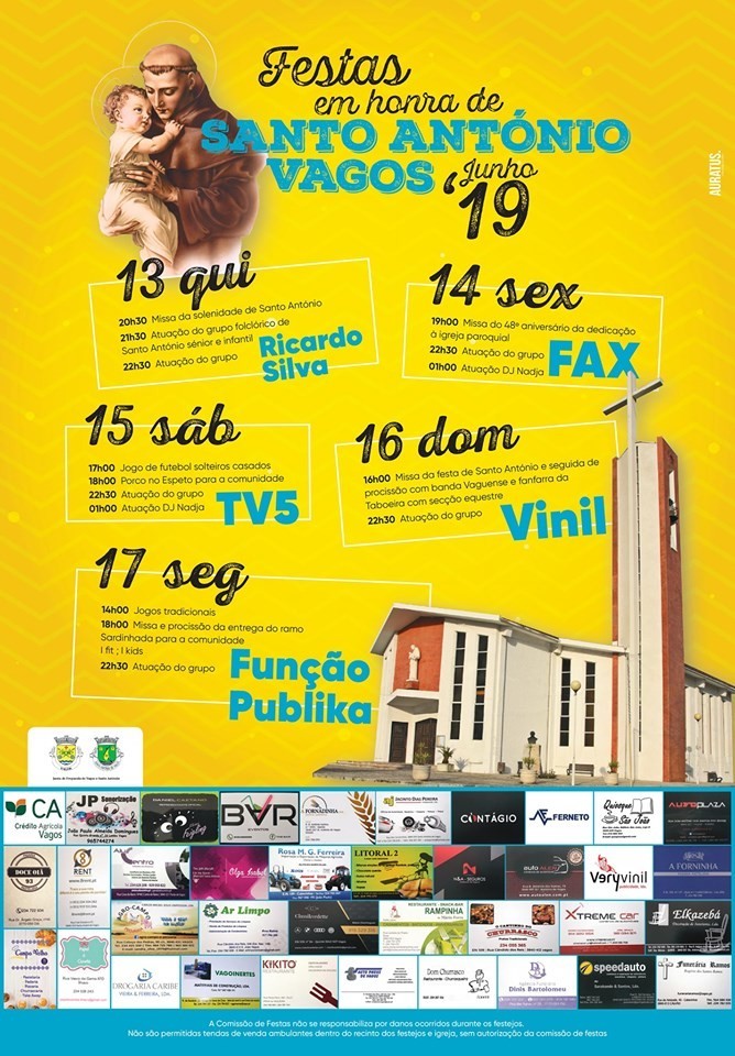 De 13 a 17 de junho de 2019, decorrem as Festas em honra de Santo António de Vagos.Consulte o cartaz com a programação.
