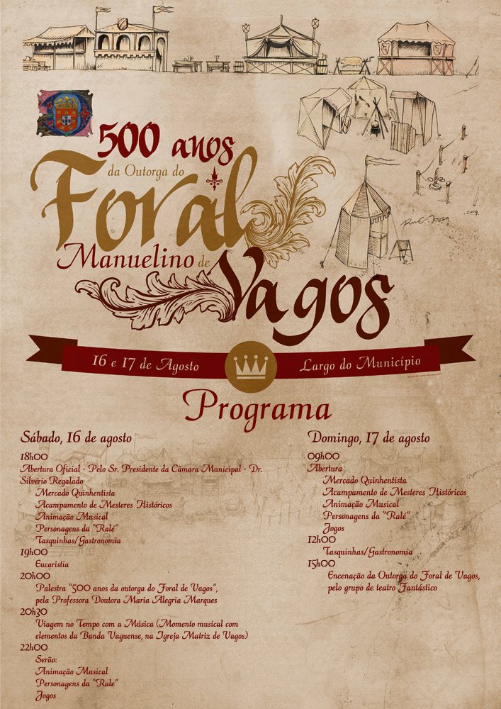 Depois do êxito das comemorações dos 500 anos da Outorga do Foral Manuelino de Soza, que decorreu nos dias 28 e 29 de junho, em Soza, será, agora, a vez de comemorar os 500 anos da Outorga do Foral Manuelino de Vagos que decorre nos dias 16 e 17 de agosto, no Largo do Município.