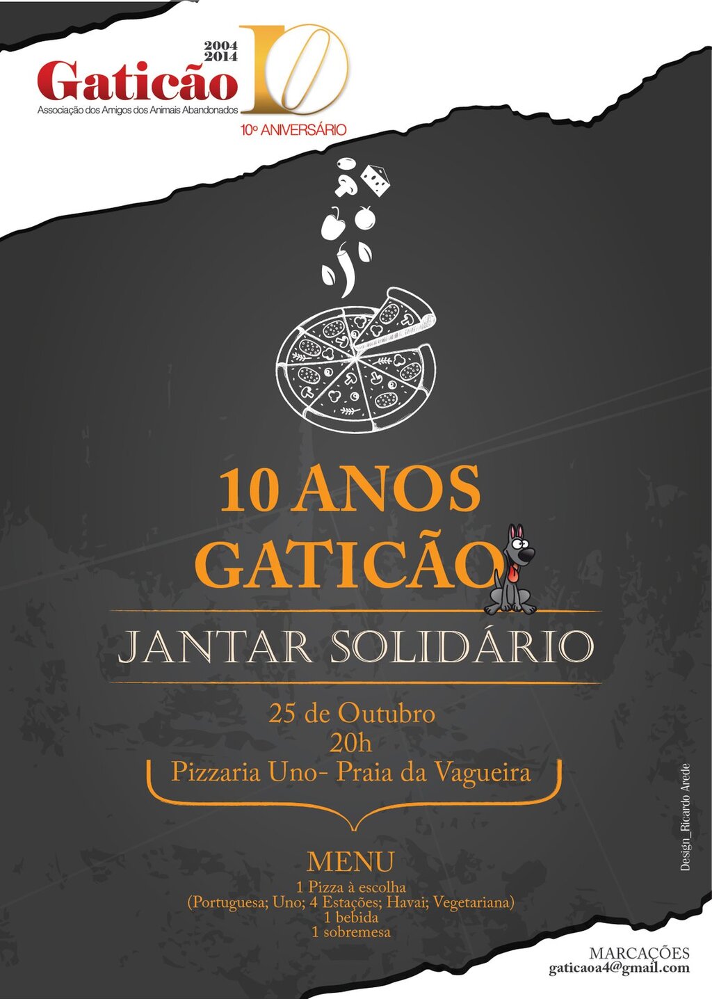 Venha comemorar com a Gaticão num jantar solidário que irá decorrer na Pizzaria Uno, na Praia da Vagueira, pelas 20h. Para tal deverá reservar o seu lugar até dia 23 de outubro enviando um email para gaticaoa4@gmail.com ou para 934338675.