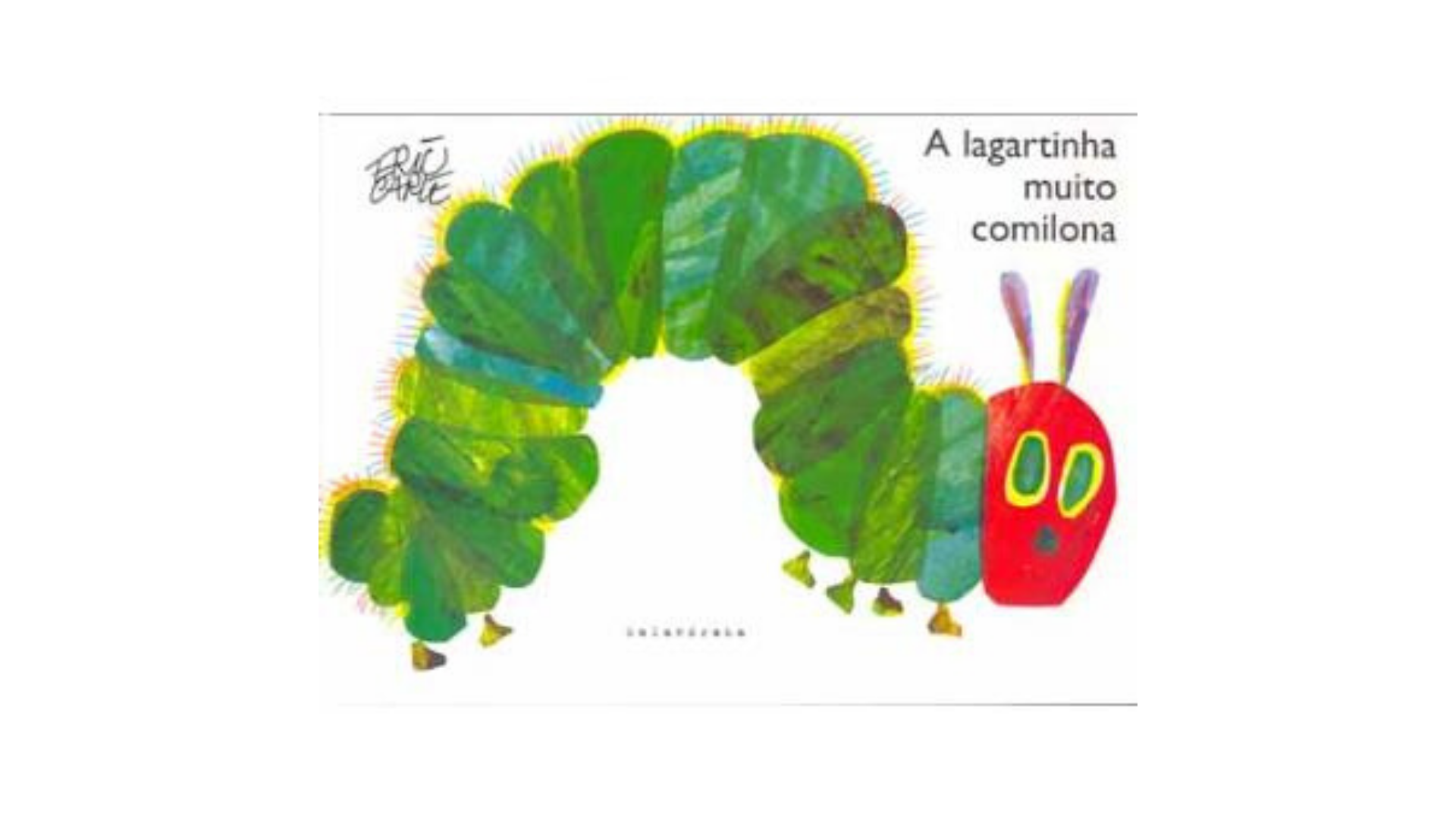 “À luz da Lua, um pequenino ovo descansava numa folha. Num domingo de manhã o sol quente chegou e PLOC!..., de dentro do ovo saiu uma lagartinha magra e esfomeada.”