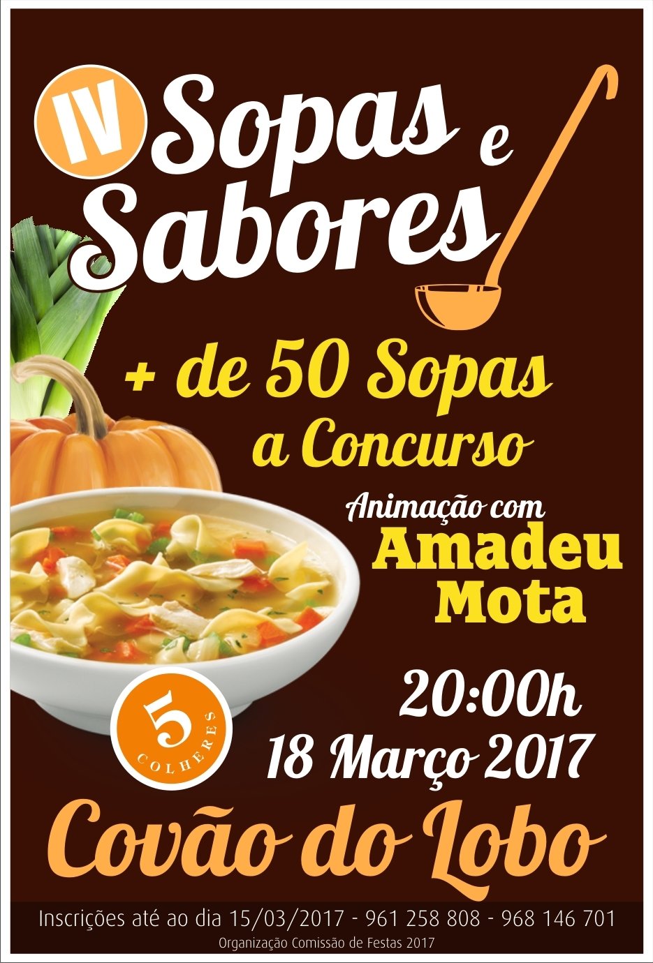 A Comissão de Festas do Covão do Lobo encontra-se a organizar o IV Festival de Sopas que se realiza no próximo dia 18 de março de 2017 (sábado), pelas 20h00, no Solar do Pousio, em Covão do Lobo.