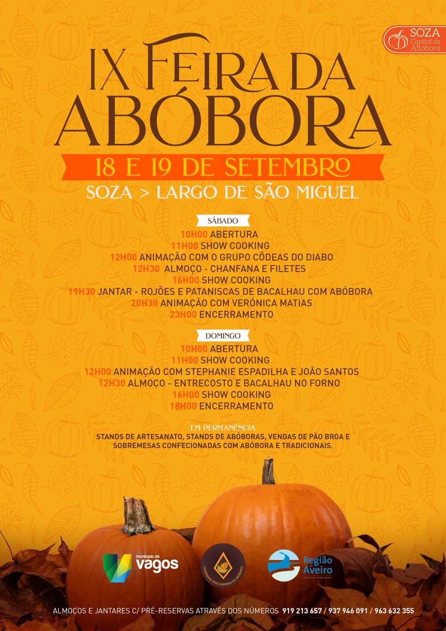 Decorre, nos dias 18 e 19 de setembro de 2021, no Largo de S. Miguel, em Soza, a 9ª Feira da Abóbora, promovida pela Confraria dos Sabores da Abóbora e pelo Município de Vagos e conta com o apoio da CIRA - Comunidade Intermunicipal da Região de Aveiro.
