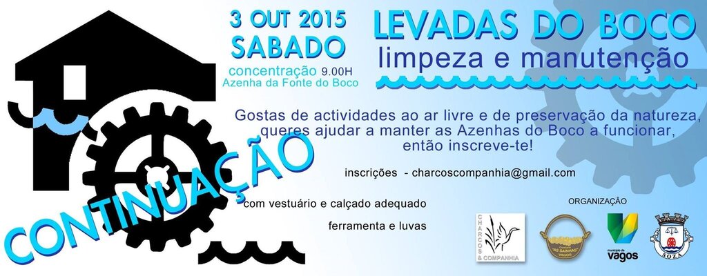 Realiza-se, no dia 3 de outubro de 2015, pelas 9h, junto à Azenha da Fonte do Boco, mais uma ação de limpeza e manutenção das Levadas do Boco. Se gostas de atividades ao ar livre e de preservar a natureza, se queres ajudar a manter as Azenhas do Boco a funcionar, então inscreve-te!! Não te esqueças de trazer: - vestuário e calçado adequado à atividade; - ferramenta e luvas Inscrições em charcosecompanhia@gmail.com Esta atividade é organizada pela associação Charcos e Companhia, Confraria “As Sainhas”, Câmara Municipal de Vagos e Junta de Freguesia de Soza.