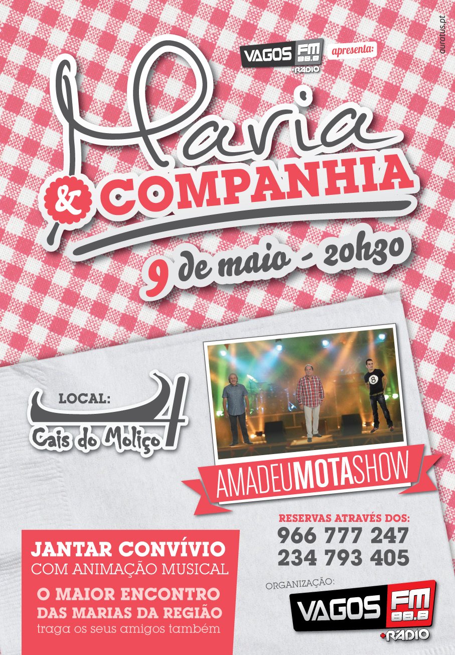 No dia 9 de maio a Rádio Vagos FM vai homenagear todas as Marias, através da realização do jantar-convívio Maria & Companhia. Este evento realizar-se-á no Cais do Moliço, a partir das 20h30, e irá contar com a animação musical do conjunto Amadeu Mota e com o sorteio de alguns prémios!