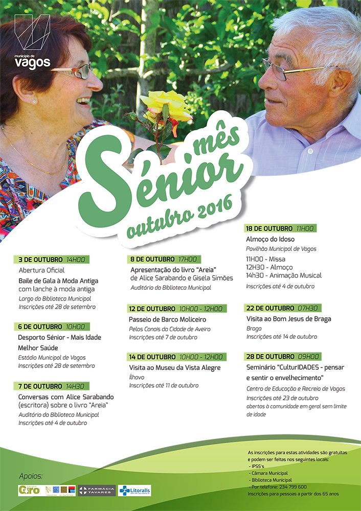 A Câmara Municipal de Vagos vem convidar todos os séniores à participação no Mês Sénior 2016. A participação nas atividades é gratuita, condicionada a inscrição prévia nas IPSS’s, na Câmara Municipal (no segurança), Biblioteca Municipal (na receção), por telefone: 234 799 600.