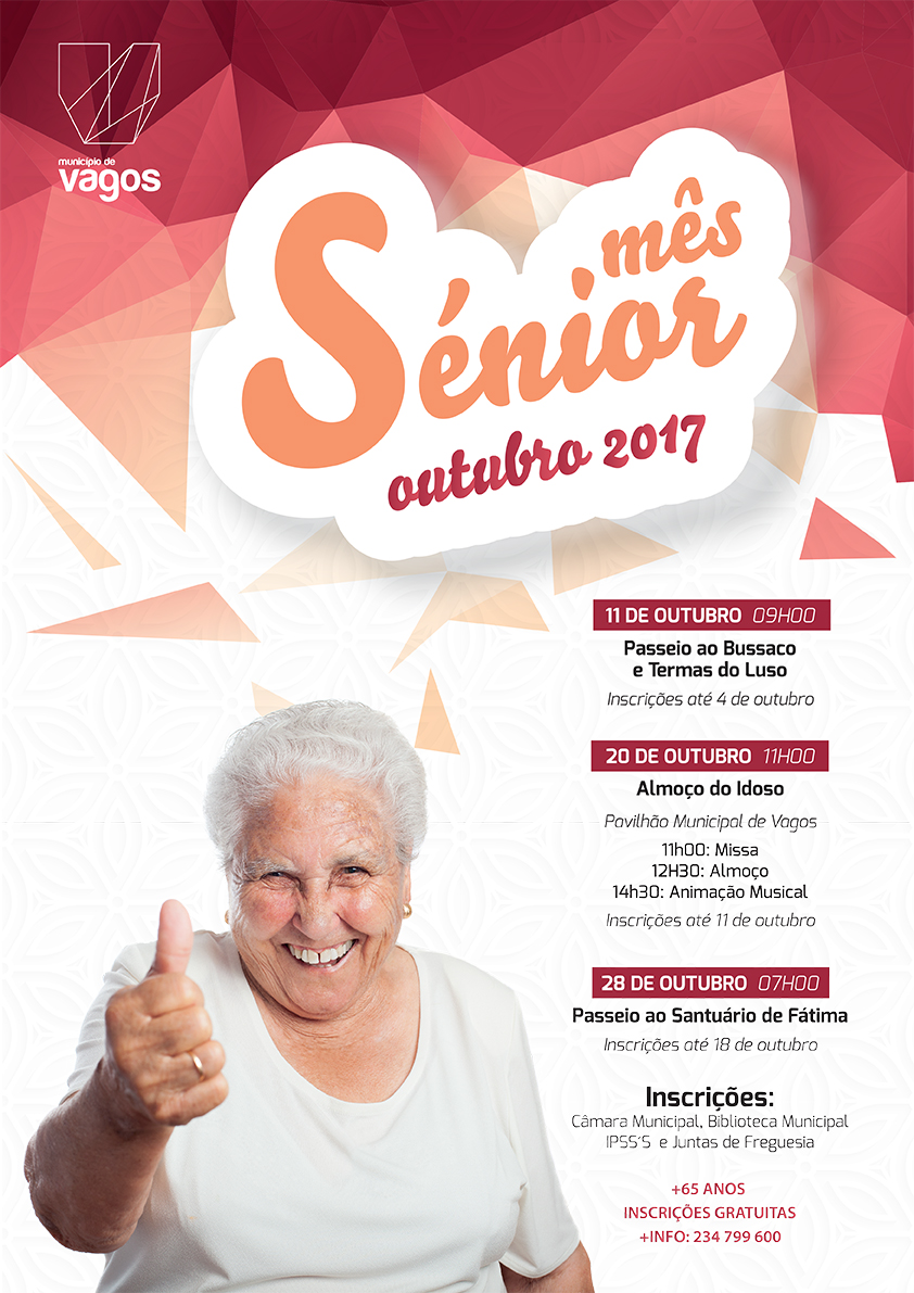 A Câmara Municipal de Vagos vem convidar todos os séniores à participação no Mês Sénior 2017. A participação nas atividades é gratuita, mas condicionada a inscrição prévia nas IPSS’s, na Câmara Municipal (no segurança), Biblioteca Municipal (na receção), ou por telefone: 234 799 600.