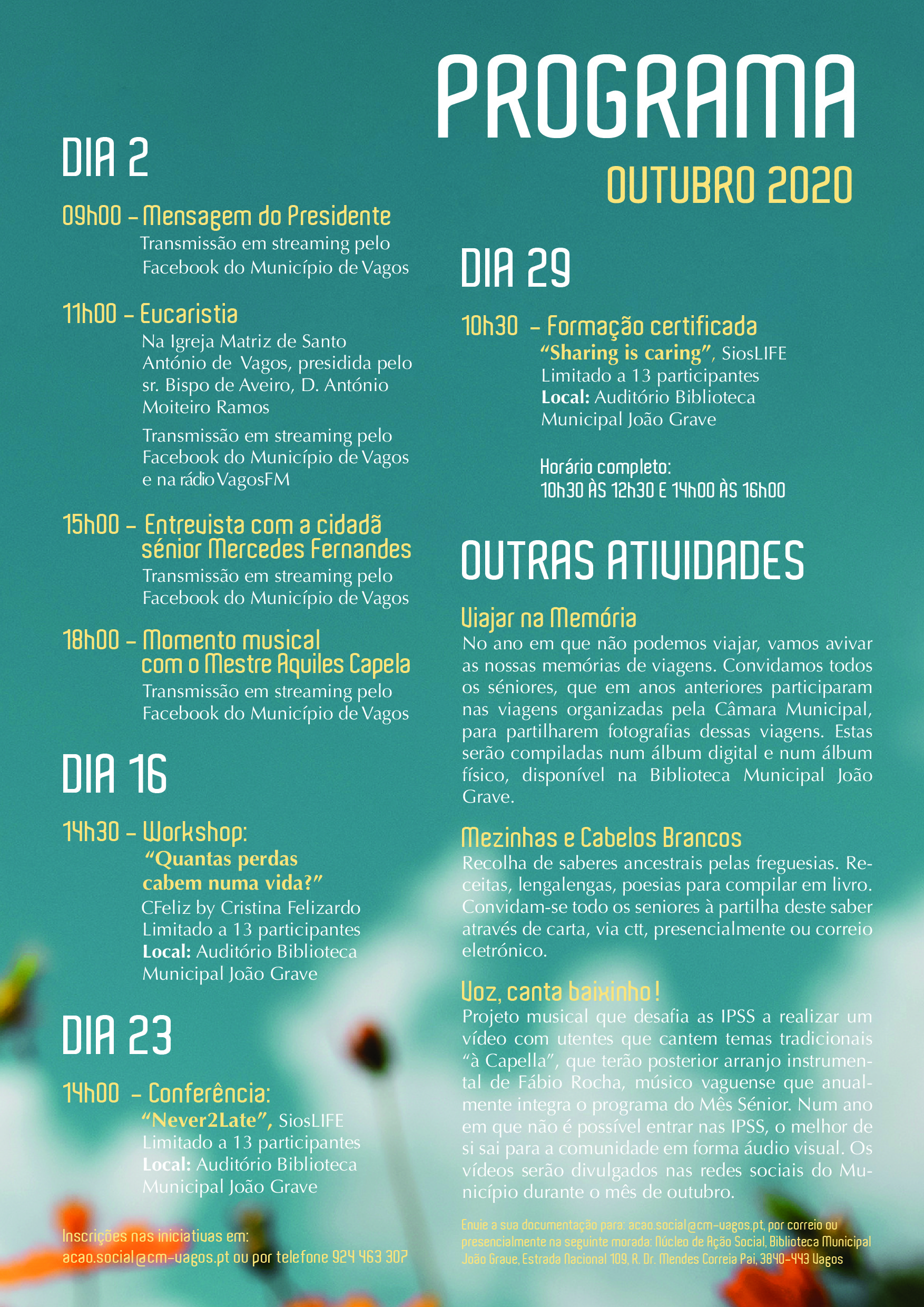 O arranque do Mês Sénior começa já esta sexta-feira, dia 2 de outubro, pelas 9h00, através da página do Facebook do Município, onde o Presidente da Câmara Municipal de Vagos, Silvério Regalado, deixará uma mensagem a todos no âmbito da comemoração do Mês Sénior. Pelas 11h00 decorre a eucaristia na Igreja Matriz de Santo António de Vagos, este ano, em formato digital e transmitida, em direto, na página do Facebook do Município de Vagos e na rádio VagosFM. A eucaristia será presidida pelo sr. Bispo de Aveiro, D. António Moiteiro Ramos.