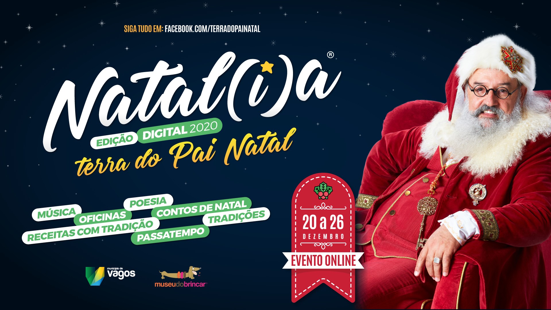 Não podendo ser realizado presencialmente, o evento Natal(i)a Terra do Pai Natal vai migrar para as redes sociais, nomeadamente para a página de Facebook - Terra do Pai Natal onde, durante sete dias, o público vai poder vivenciar o espírito de natal em toda a sua plenitude, num formato digital em www.facebook.com/terradopainatal.