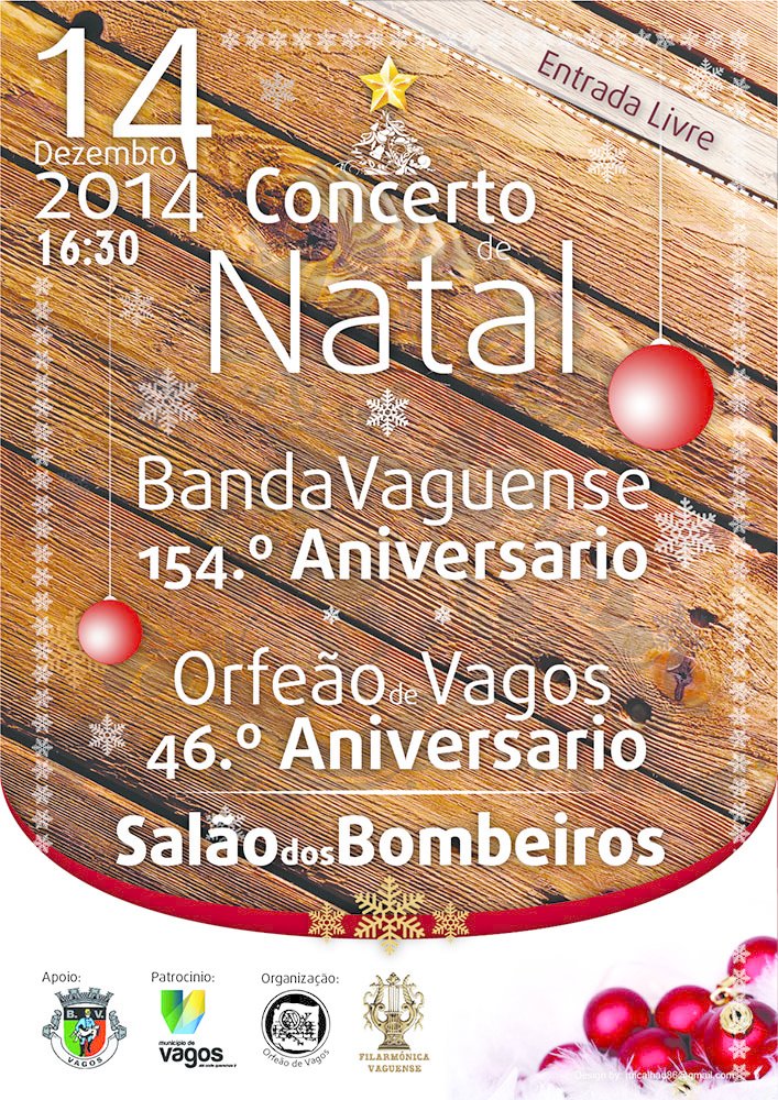 O Orfeão de Vagos juntamente com a Filarmónica Vaguense vão festejar o seu 46.º Aniversário e o 154.º Aniversário, respetivamente, com um Concerto de Natal que decorre no próximo dia 14 de dezembro de 2014, pelas 16h30, no Salão dos Bombeiros de Vagos.