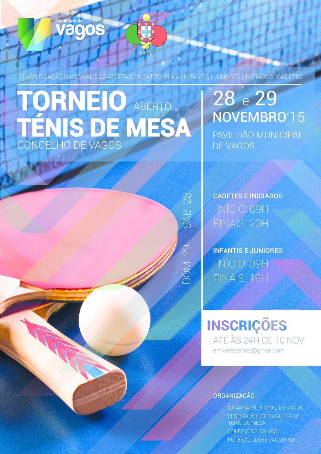 O XI Torneio aberto de Ténis de Mesa do Concelho de Vagos realiza-se nos dias 28 e 29 de novembro, no Pavilhão Municipal de Vagos, com oito provas de classificação nacional da categoria A de Infantis, Juniores, Iniciados e Cadetes.