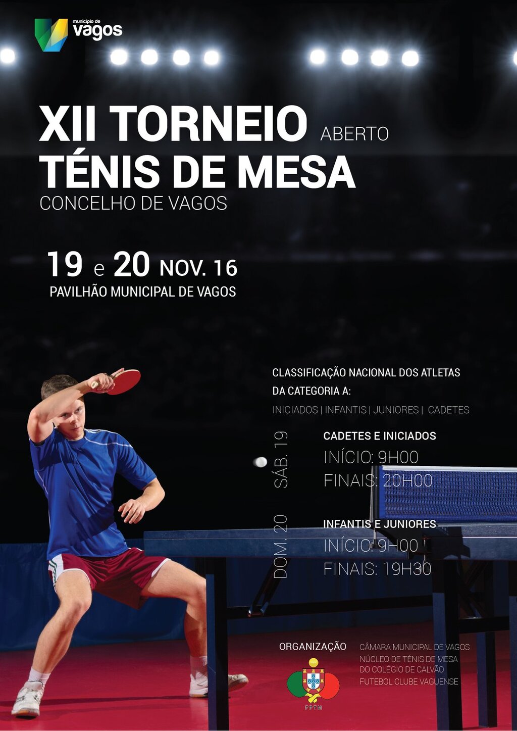 O XII Torneio aberto de Ténis de Mesa do Concelho de Vagos realiza-se nos dias 19 e 20 de novembro, no Pavilhão Municipal de Vagos, com oito provas de classificação nacional da categoria A de Infantis, Juniores, Iniciados e Cadetes.
