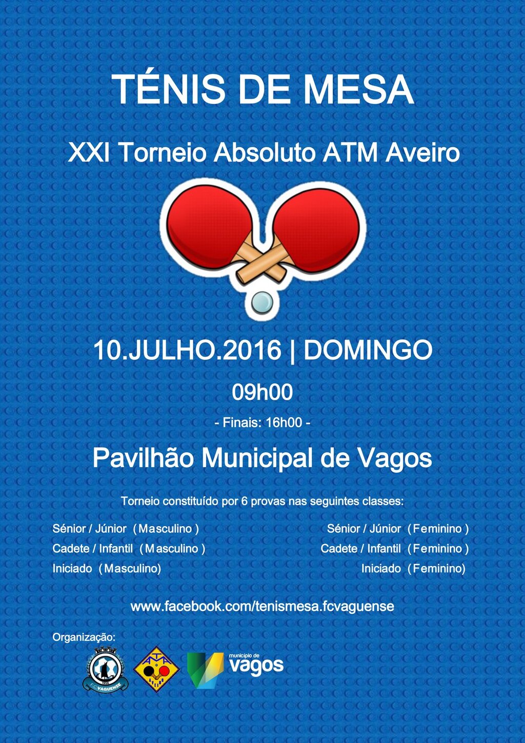 No próximo domingo, 10 de julho de 2016, o Pavilhão Municipal de Vagos recebe o XXI Torneio Absoluto da Associação de Ténis de Mesa (ATM) de Aveiro. O torneio está marcado para as 9h00 e as finais para as 16h00.