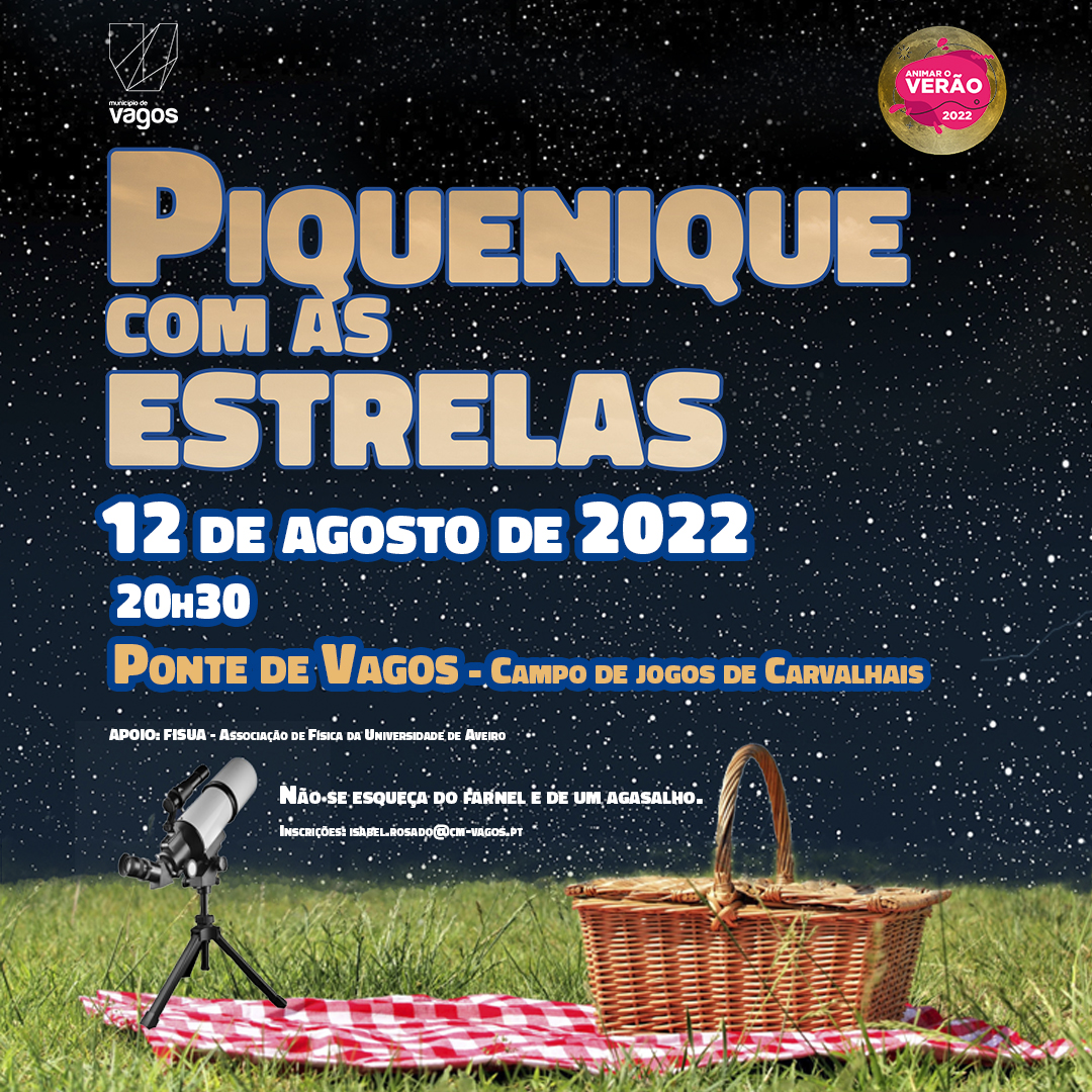 No próximo dia 12 de agosto, realiza-se a atividade "Piquenique com as Estrelas", no Campo de Jogos de Carvalhais, na freguesia de Ponte de Vagos pelas 20h30.