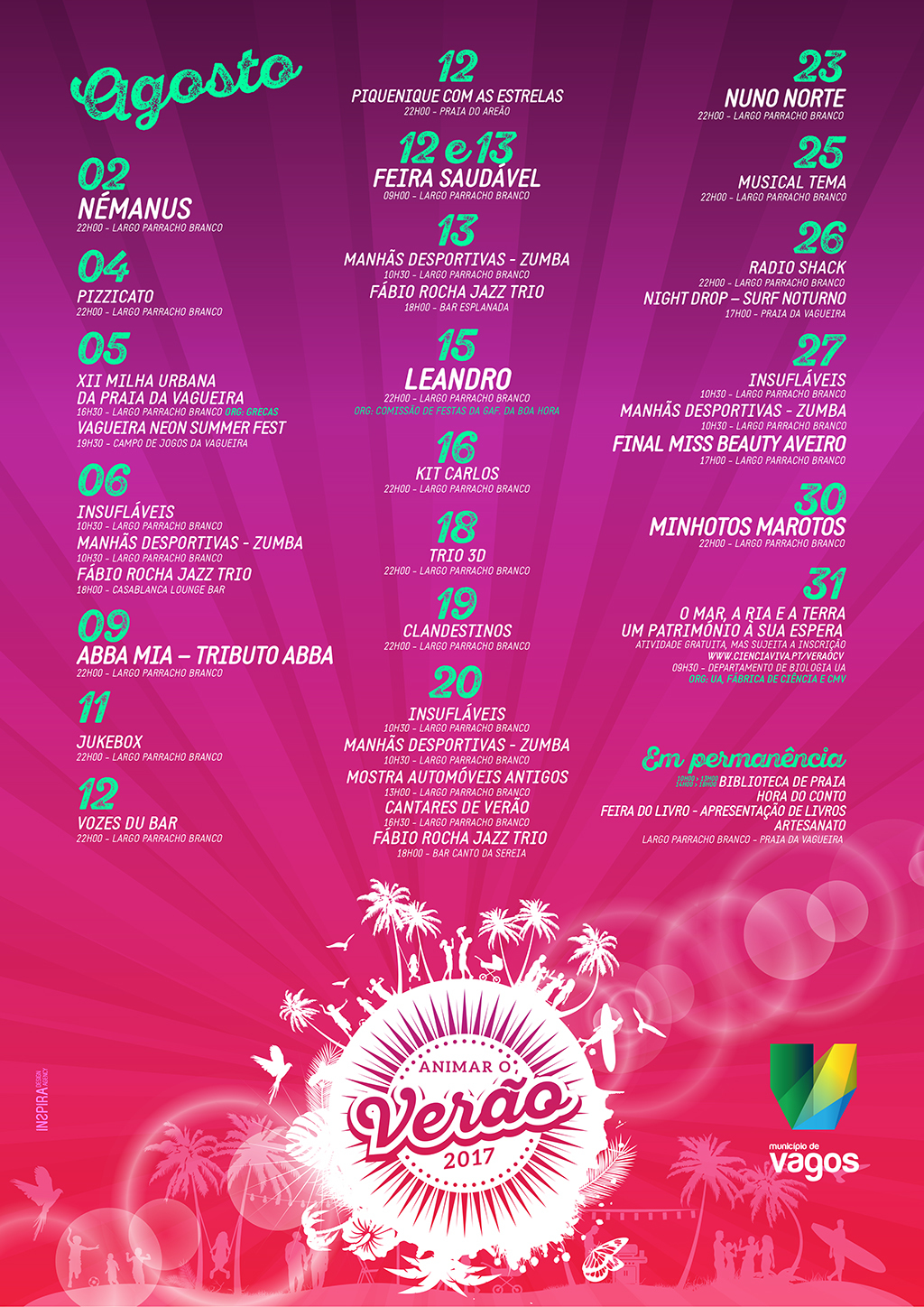No dia 5, o Largo recebe, a partir das 16h30, a XVII Milha Urbana, da organização do GRECAS, e ao final do dia, pelas 19h30, realiza-se mais uma edição do VAGUEIRA NEON SUMMER FEST, no campo de jogos da Vagueira. No dia seguinte, domingo dia 6, os insufláveis estarão no Largo Parracho Branco ao longo de todo o dia e regressam nos dias 20 e 26 de agosto. As manhãs desportivas com Zumba decorrem todos os domingos de manhã, a partir das 10h30.