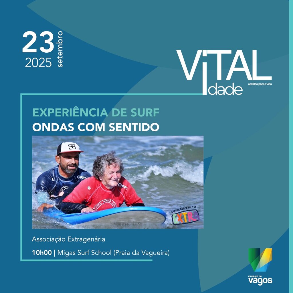 A atividade realiza-se no dia 23 de setembro de 2025, com a escola de Surf Muiguel Surf School, na Praia da Vagueira