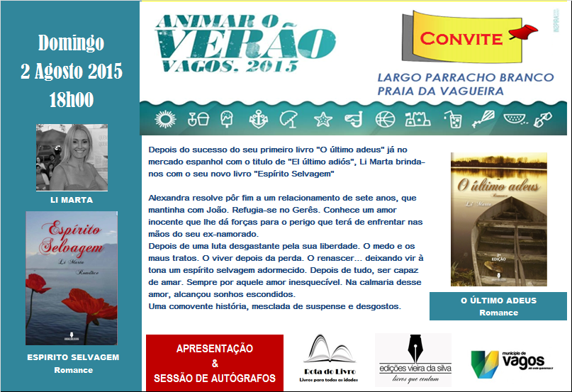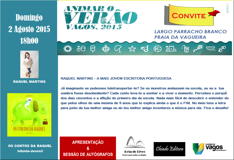 A “Rota do Livro” conta com a presença no próximo domingo, dia 2 de agosto de 2015, na Praça Central da Vagueira, a partir das 18h, das escritoras Raquel Martins e Li Marta.