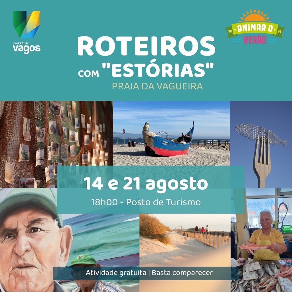 Se sim, nos dias 14 e 21 de agosto (quartas-feiras), marque presença, junto ao Posto de Turismo da Vagueira, às 18h00, e participe no Roteiros com “Estórias” que proporcionará a possibilidade de conhecer alguns locais emblemáticos da praia assim como pessoas e as suas histórias de vida ligadas às tradições locais.