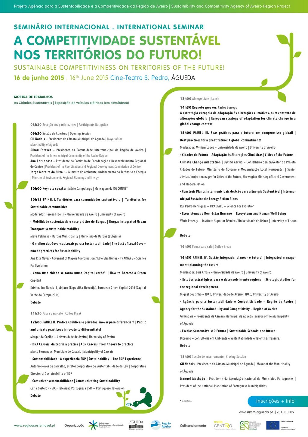 Realiza-se, no próximo dia 16 de junho, às 9h30, no Cineteatro São Pedro, em Águeda, o Seminário Internacional 'A Competitividade Sustentável nos Territórios do Futuro!”, organizado pelo projeto da Agência para a Sustentabilidade e a Competitividade - Região de Aveiro da qual faz parte o município de Vagos juntamente com os restantes municípios da CIRA.