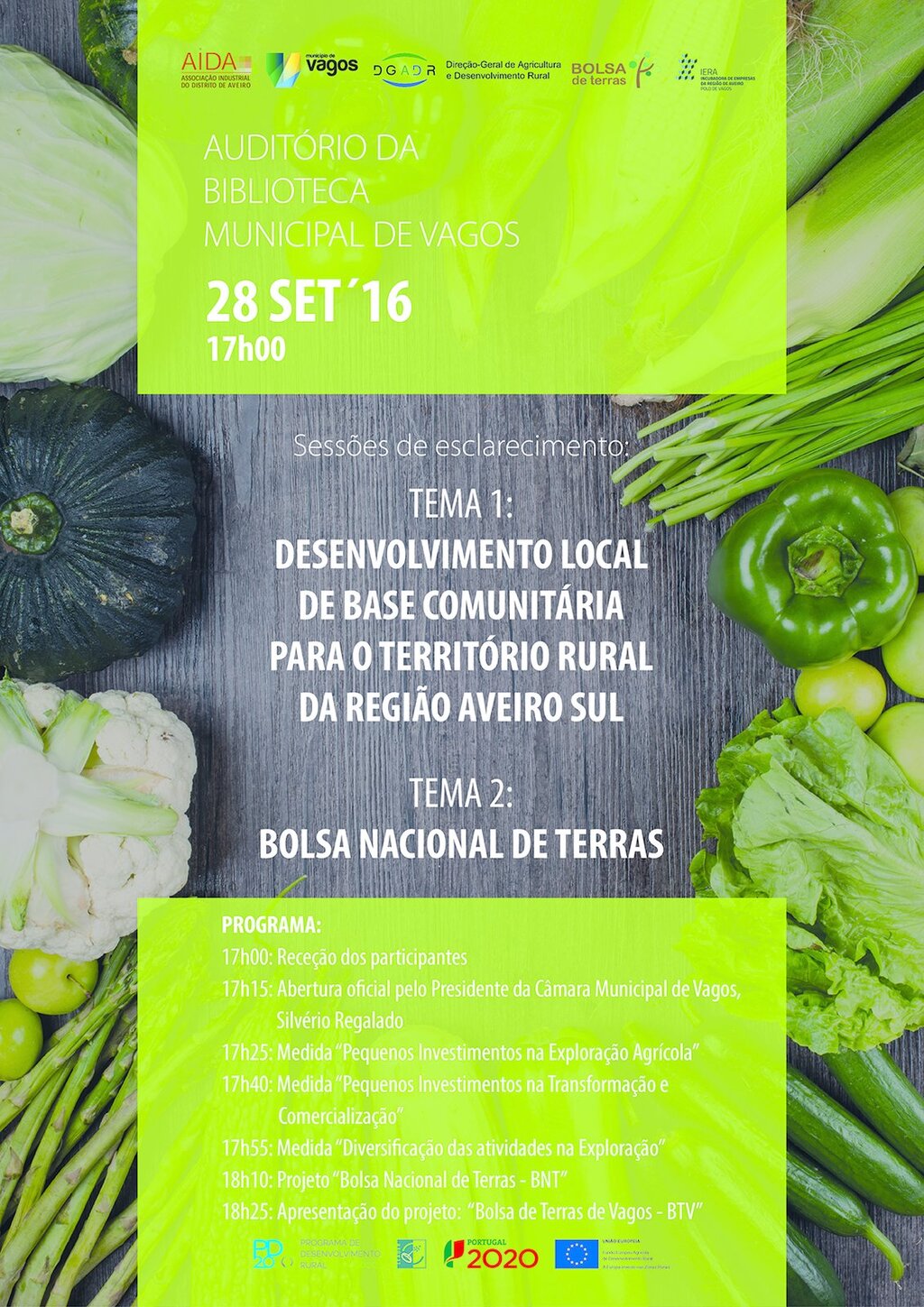 A primeira temática da sessão será dinamizada pela Associação Industrial do Distrito de Aveiro – AIDA, com o apoio da Câmara Municipal de Vagos, e visa apresentar as oportunidades de financiamento disponíveis para empresários e empreendedores agrícolas ou do setor agroalimentar que pretendam realizar investimentos nas tipologias “Pequenos Investimentos na Exploração Agrícola”, “Pequenos Investimentos na Transformação e Comercialização de Produtos Agrícolas” e “Diversificação das Atividades na Exploração”, medidas inseridas no Plano de Desenvolvimento RURAL 2020 (PDR 2020).