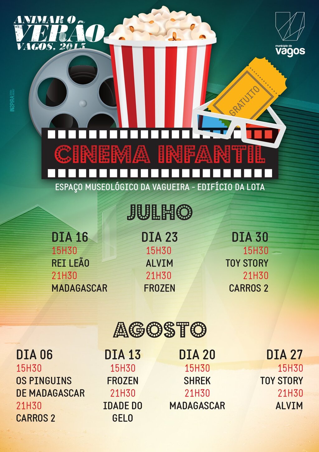 Inserido na programação do projeto “Animar o Verão 2015”, realizam-se nos dias 16, 23 e 30 de julho e nos dias 6, 13, 20 e 27 de agosto, as sessões de cinema infantil, com horário marcado para as 15h30 e 21h30, no Espaço Museológico da Vagueira, no edifício da Lota. Estas sessões, com entrada gratuita, contam com a seguinte programação: