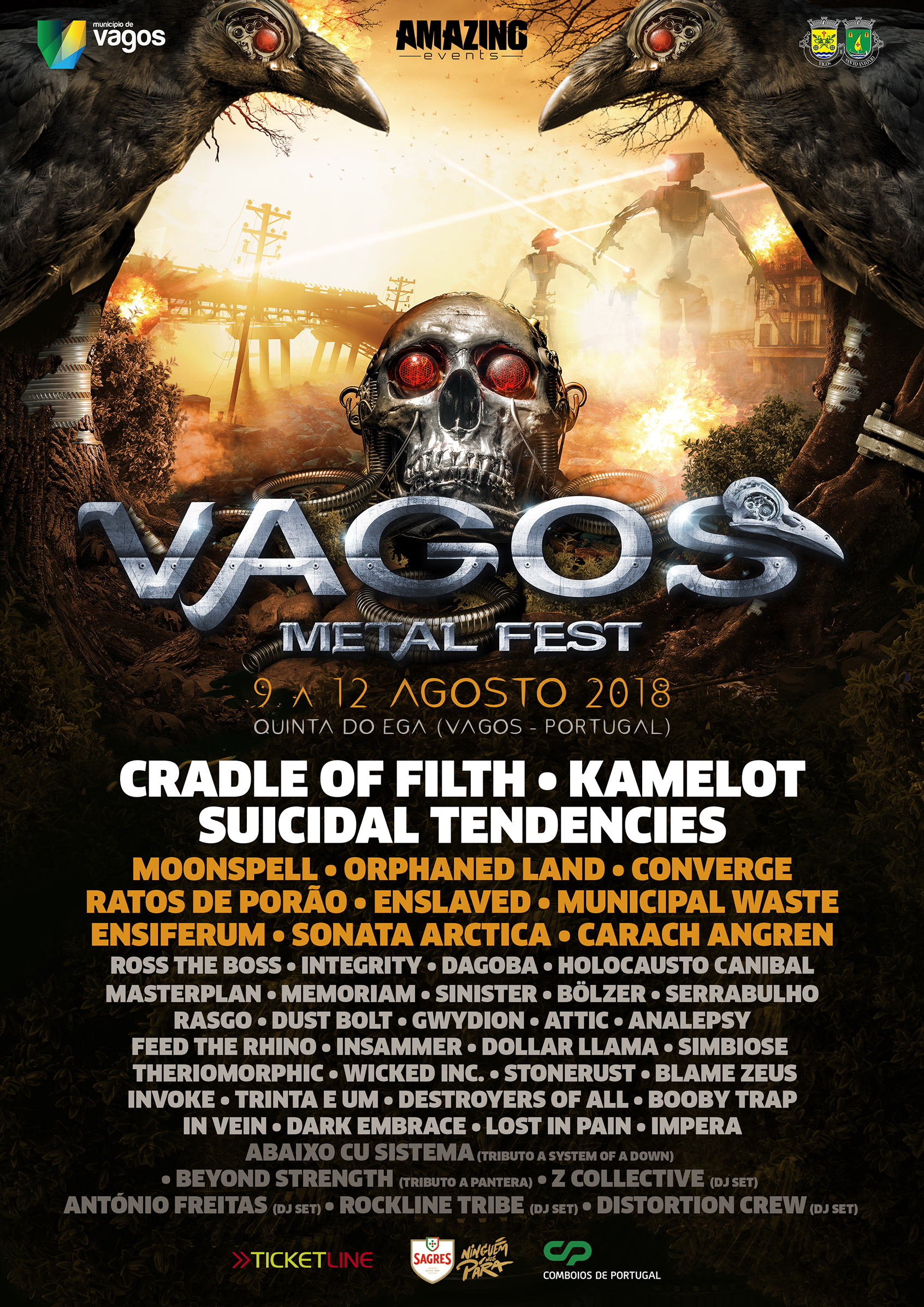 A terceira edição do Vagos Metal Fest, irá realizar-se nos dias 9, 10, 11 e 12 de agosto de 2018, na Quinta do Ega (Município de Vagos). Este ano o cartaz conta com 40 bandas que prometem fazer deste fim de semana um dos melhores para umas férias cheias de grandes concertos, muito convívio e o ambiente que só Vagos pode proporcionar aos amantes do metal. Este ano, pela primeira vez, o VMF18 conta com dois palcos que irão receber as mais prestigiadas bandas nacionais e internacionais do universo do Metal.