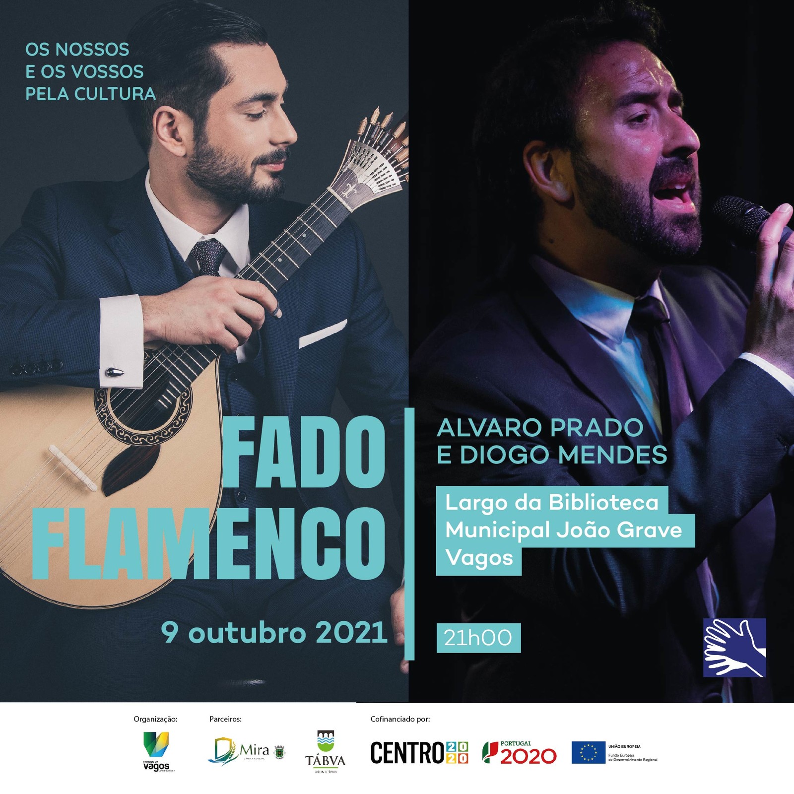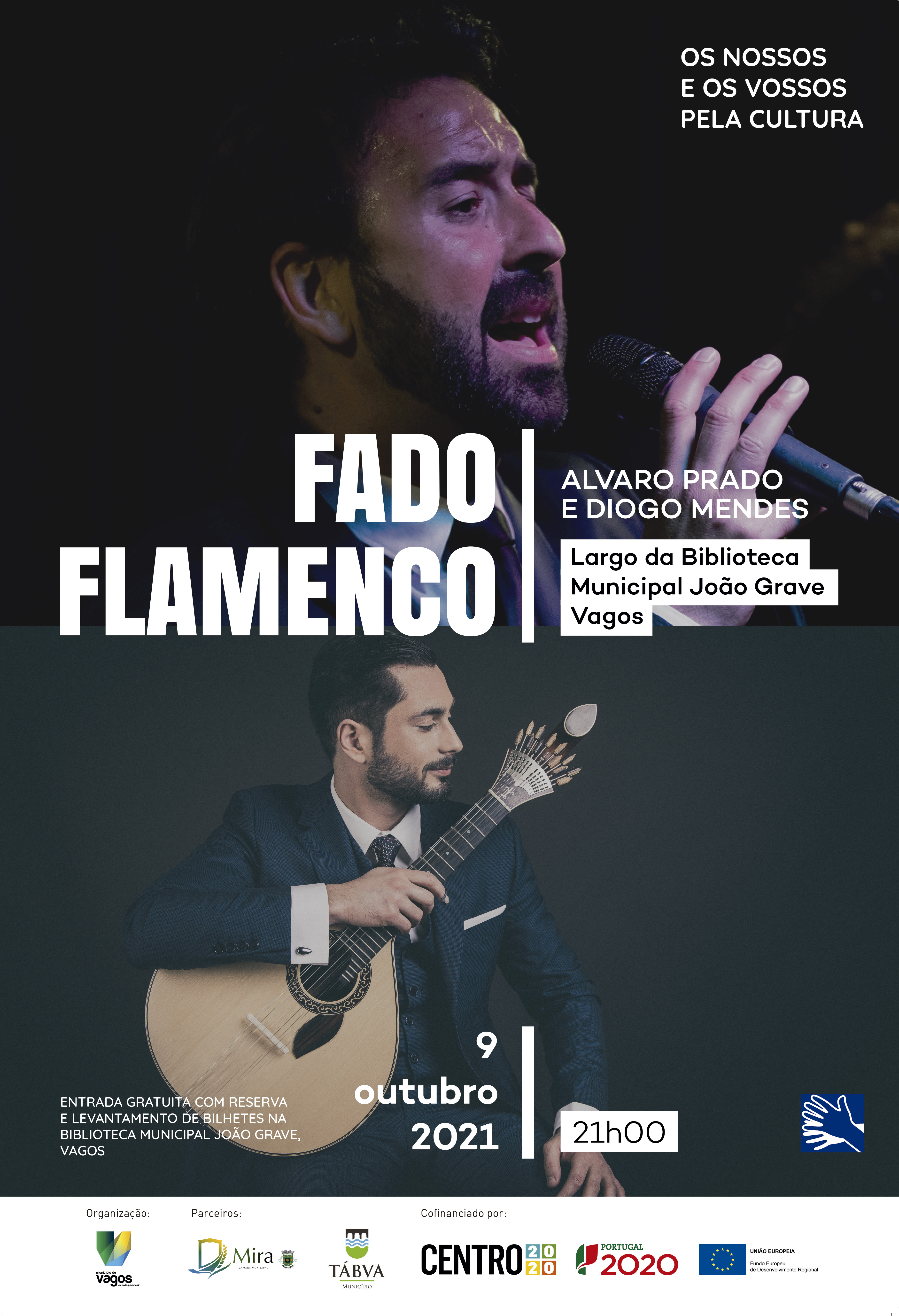 O espetáculo “Fado Flamenco” vai ser apresentado, em Vagos, no dia 9 de outubro, sábado. O evento realiza-se no Largo da Biblioteca Municipal João Grave, pelas 21h. A entrada é gratuita, mas sujeita a reserva e a levantamento de bilhetes na Biblioteca Municipal João Grave.