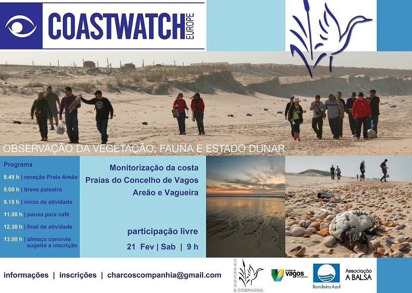 Irá decorrer, no dia 21 de fevereiro de 2015, pelas 9h, a monitorização e observação da praia do Areão e Vagueira, ação de caráter ambiental organizada pela associação ambiental - Charcos & Companhia, inserida no Projeto Coastwatch com a coordenação da Câmara Municipal de Vagos.
